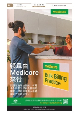 A 2 2639ആ!3137я3͠24͞!ߏആ̢ 帳單由 Medicare 來付 隨著政府增加撥款,有更 多全科醫生提供全額報銷 服務,讓所有澳洲人看病 都更方便和便宜。 找尋就近提供全額報銷服務的全科醫生可瀏覽 health.gov.au/bulkbilling 澳洲政府於堪培拉授權 Authorised by the Australian Government, Canberra